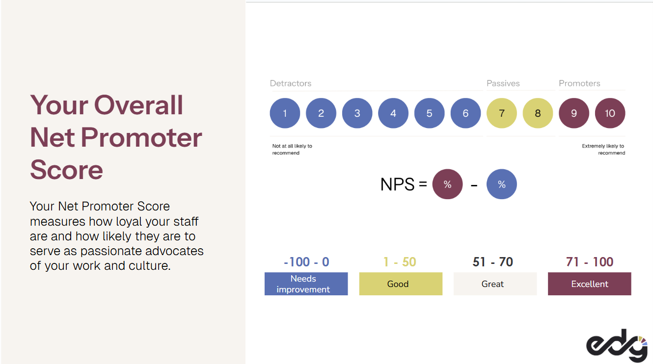 To gauge engagement and loyalty across your organization, include a question that measures your employee net promoter score (eNPS). This score helps reveal how likely your team members are to recommend your organization as a great place to work—an indicator of trust, satisfaction, and connection to your mission.